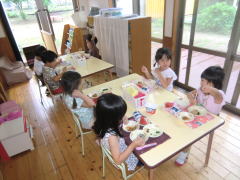 今日のメニューにスイカがあると知った園児達は、「キャァーッ!」と喜びの声を上げて楽しみにしていました。「いいなぁ子ども達は!スイカ一切れで大きな幸せを感じるんだから!」