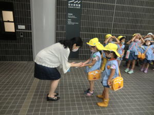 今年の年長さんはコロナ禍中で、1クラス30人が2台に分乗して、3日に分かれて熊本博物館に行きます。今日はつき組でした。