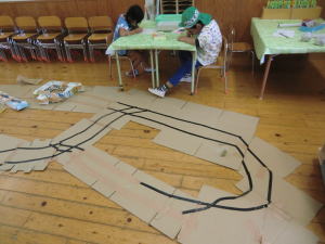 室内の様子。鉄道レールの模型?二人は色塗りに熱中していました。
