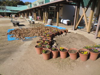 サザンカの花が「たき火だ、たき火だ、落ち葉たき~」と、想起させます。園では、昨日と今日、イモを焼いて食べています。特製です!!