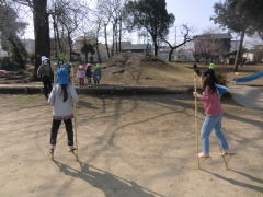 竹馬を乗りこなす年長児。憧れて見ている園児達。その先に咲く花桃。