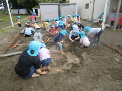 すみれ組の砂場遊びはダイナミックに展開され、園児達は満足顔でした。