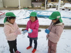 先日の大雪で、園庭一面の銀世界。登園した子ども達は、大喜びで雪遊びをしました。雪を丸めて投げたり、雪だるまを作ったり、つららを発見したりと、普段経験の少ない雪遊びを満喫しました。