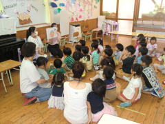 学生が時間をかけ、話し合って、改善を重ねてつくった「紙芝居」を、園児達はしっかり見入って楽しんでいました。