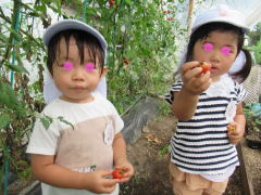 園で収穫したキュウリを食べます。キュウリが大きく見えますね。