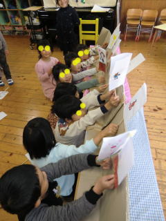 裏では、7人の園児達が「三匹の子ブタ」の劇を演じています。