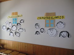 目がキラキラ輝いて、明るい希望に満ちているように感じます。年長組は遊戯室で卒園式の練習をしています。年長組の部屋から遊戯室に向かう途中、園児達は次のような掲示物を見ています。