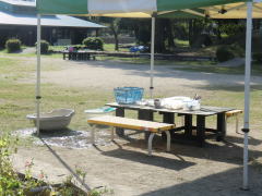 そうめん流しをした後の机と竹です。園児達はどんぐりや水や種などを転がして遊びを楽しみます。