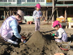 一緒に裸足になって泥水遊び。園児との会話から学びます。