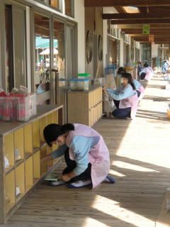 園児が帰った後のお掃除の時間です。きれいな整った環境を準備するのも、保育者の役割です。