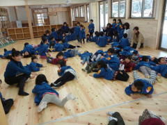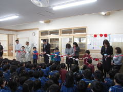 竣工式の翌日、子ども達参加の園舎お披露目会をしました。お世話になった業者さんをお招きしました。テープカットをして、年長児からお手紙やメダルのプレゼントを渡し、歌のプレゼントを披露しました。設計士さんから「新しい園舎でたくさん過ごして、この建物を君たちで育ててください」と温かい言葉を頂きました。新園舎での生活を楽しみにしている子ども達です。