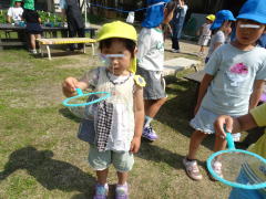 夏になって、各クラスにシャボン玉遊びができるよう準備をしました。シャボン玉遊びの中ではいろいろなやり取りがあっています。うまく膨らまないときに「あれ?きえちゃった」「ゆっくり吹けば大きくなるよ。」「ふぅってしなきゃ」と息を弱めるなど、様々な疑問や工夫する姿を見て、思わず拍手をしたくなりました。