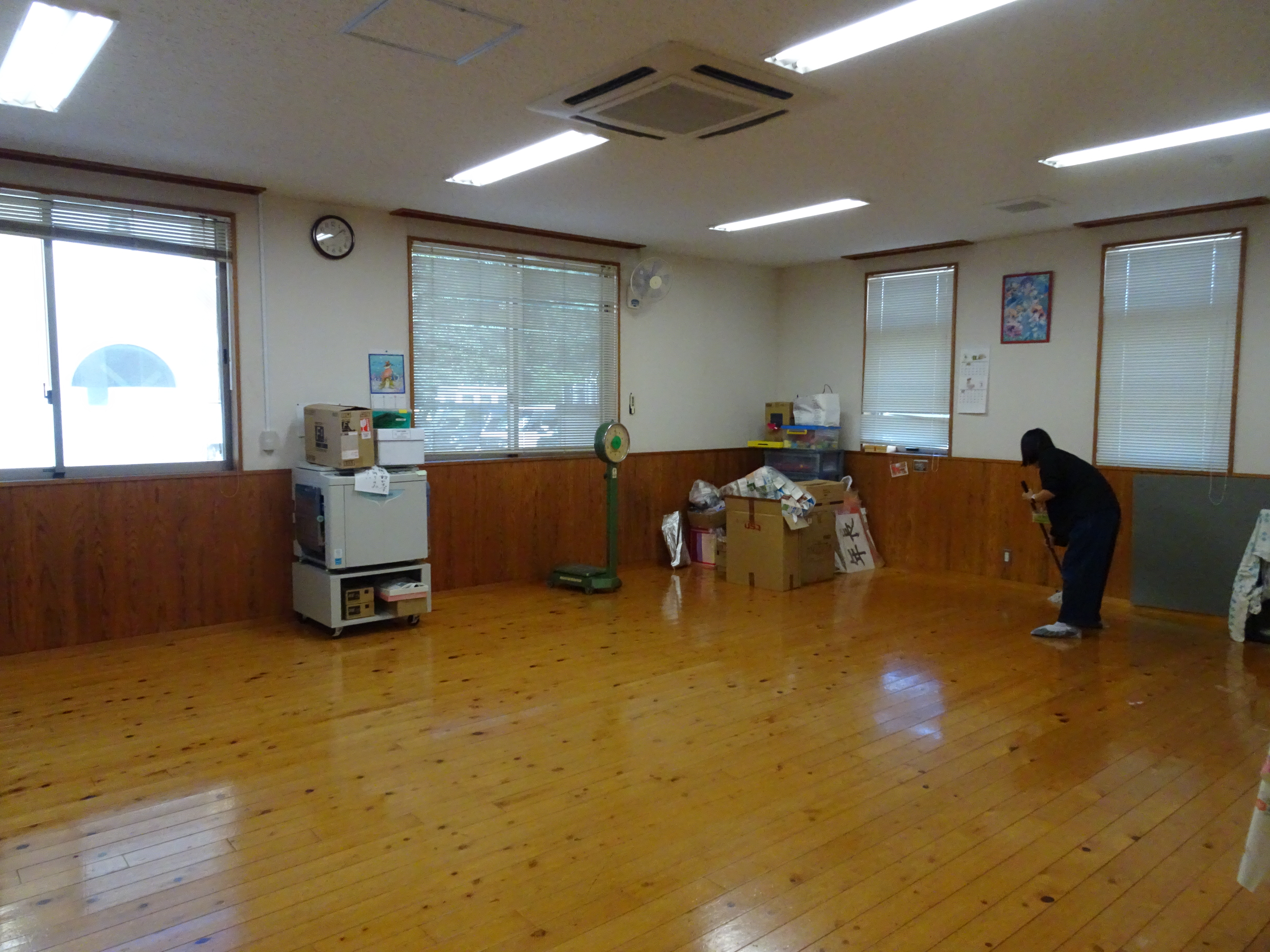 遊戯室の窓ふき、ワックス掛けのようすです。