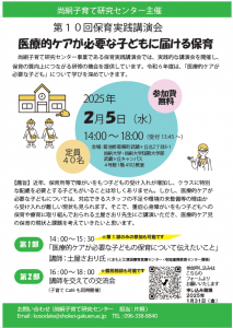 尚絅子育て研究センター事業である保育実践講演会では、実践的な講演会を開催し、保育の質向上につながる研修の機会を提供しています。今年度は、「医療的ケアが必要な子ども」について学びを深めていきます。第1部は、くまもと江津湖療育医療センター・地域連携教育センター課長の土屋さおり先生にご講演をいただき、第2部では土屋先生を交えての交流会(個別相談も可)を実施いたします。皆様のご参加をお待ちしております。