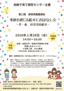 尚絅子育て研究センター主催、第11回保育実践講演会についてお知らせいたします。今回は、「季節を感じる絵本とおはなし会」を行います。