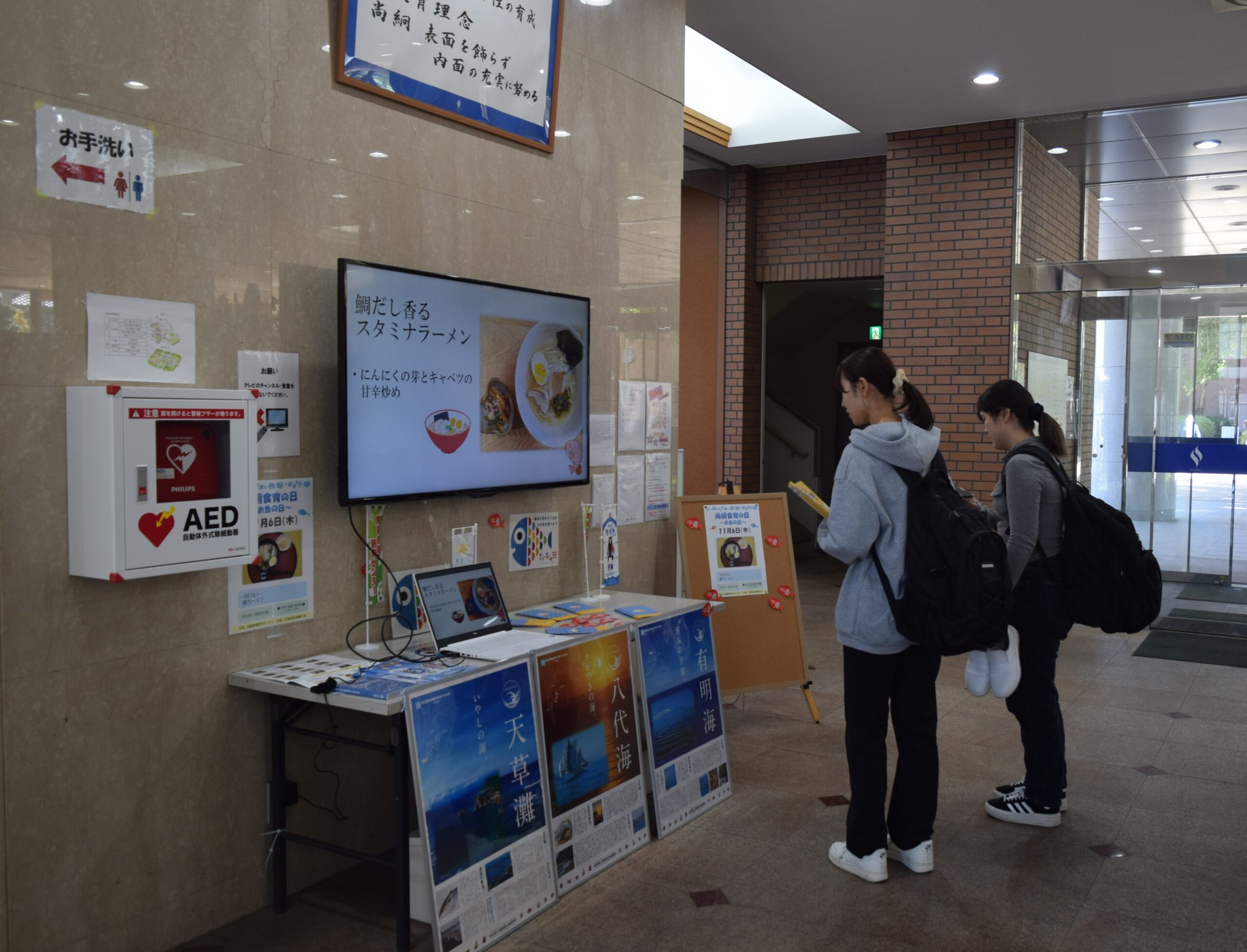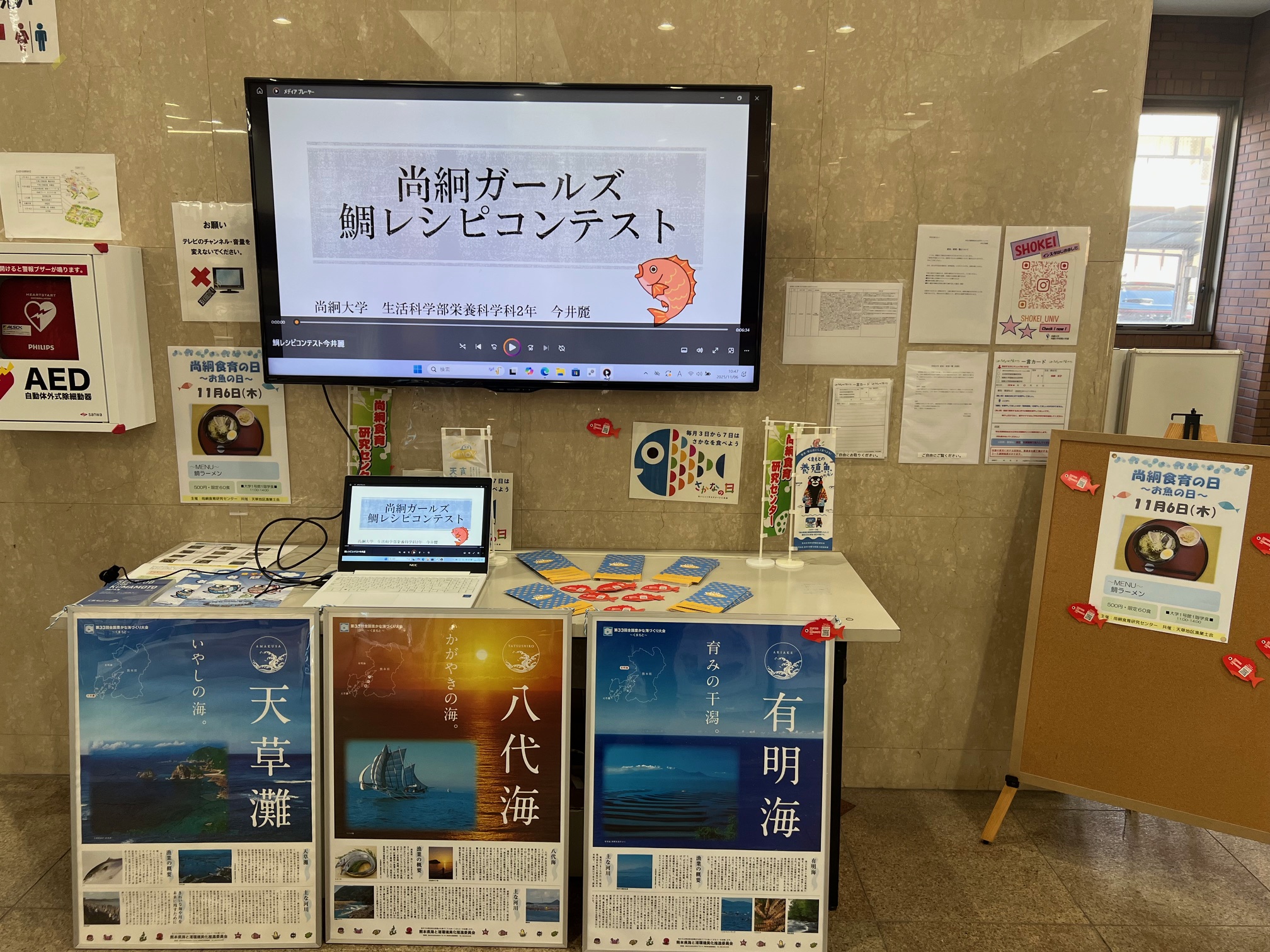 当日は、天草の漁業に関する資料の展示や鯛ラーメンのレシピ動画を放送しました。尚絅食育の日を通して、県産水産物や食育について改めて考えることができるきっかけになったことと思います。