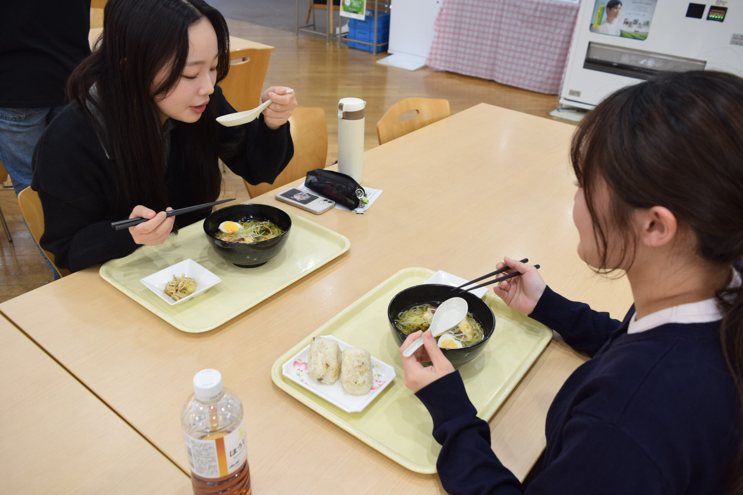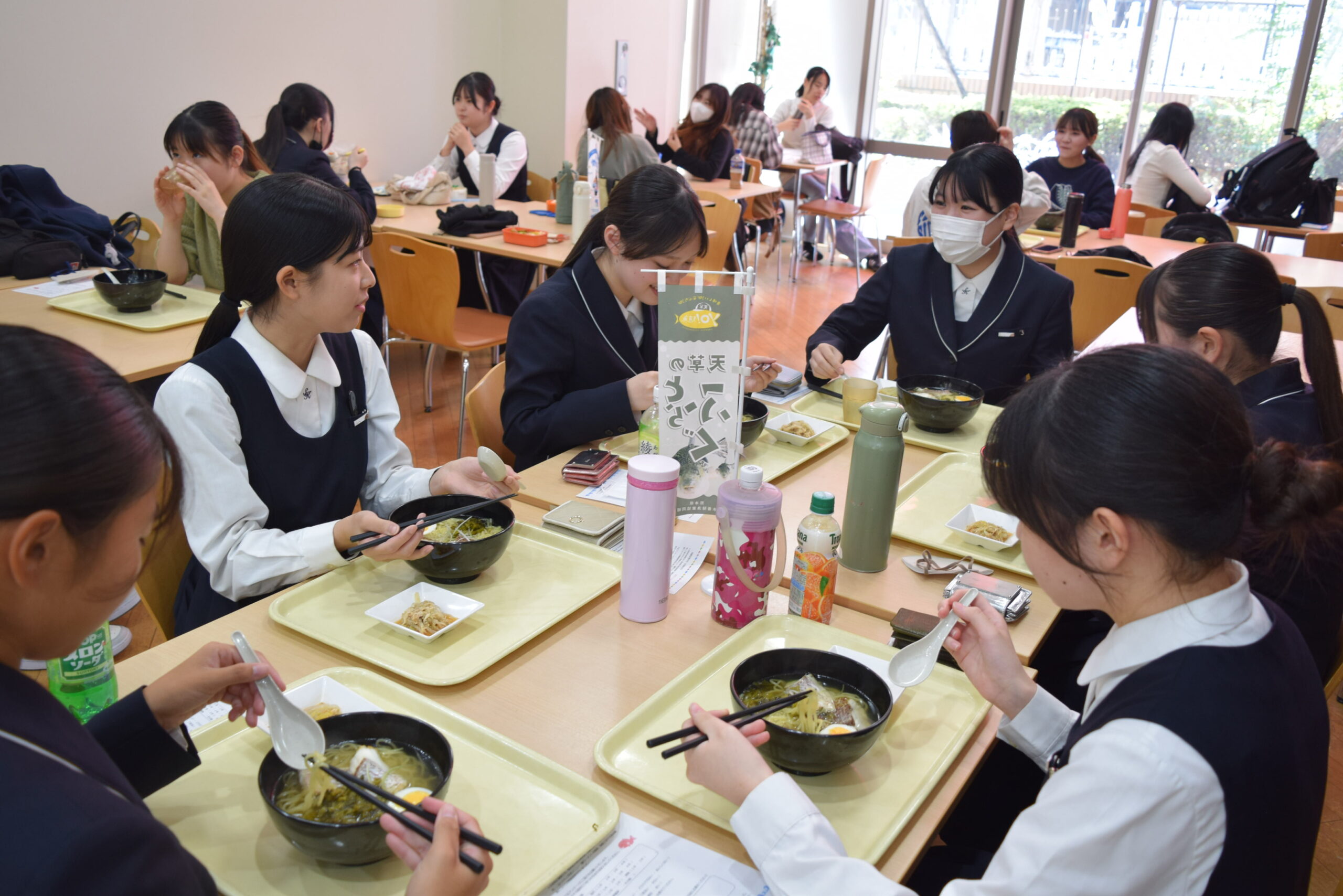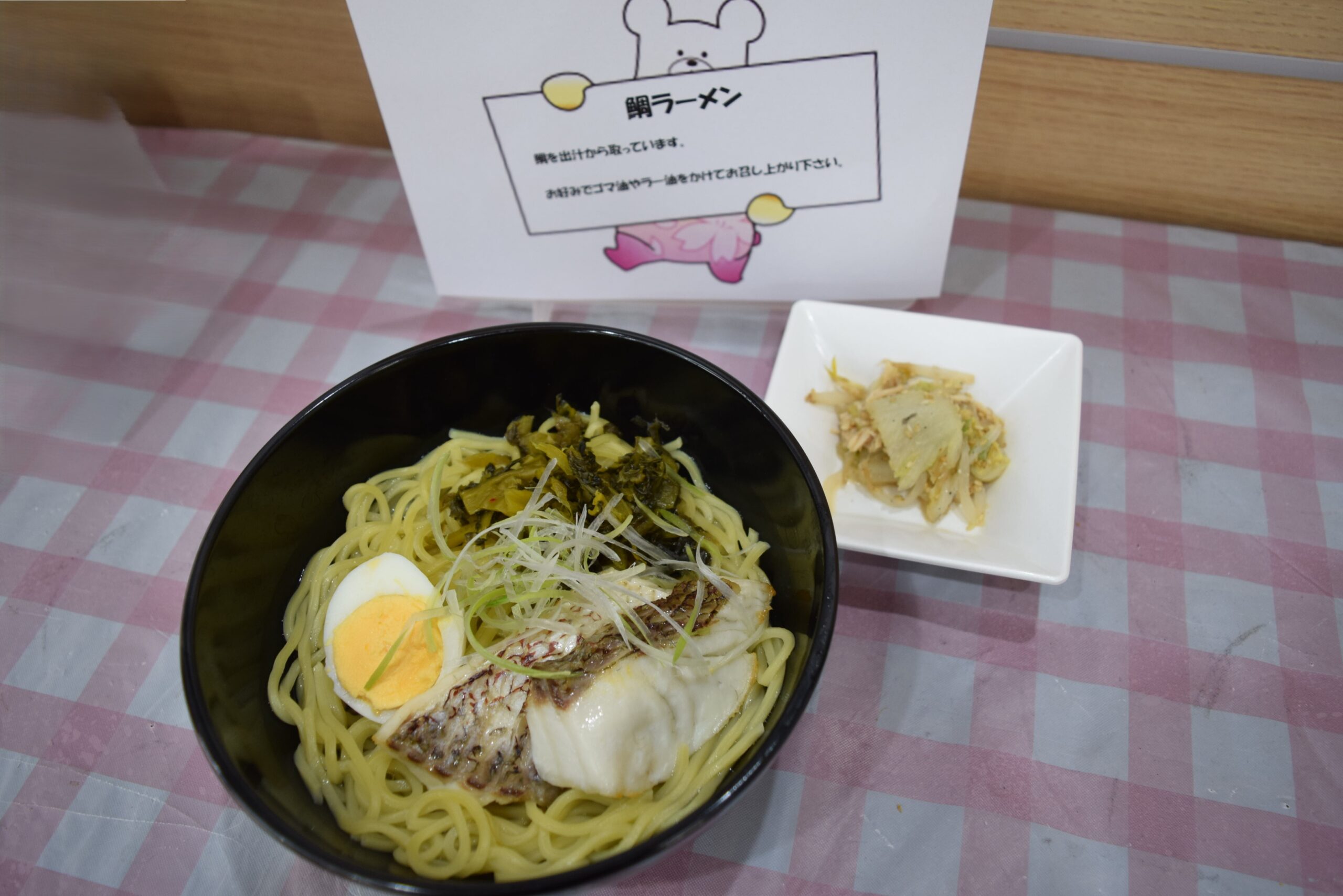 今回の特別メニューとして、学生が考案し学食レシピコンテストでグランプリを受賞した「鯛ラーメン」を提供しました!60食に増やして提供しましたが、学生や教員、高校生、外部の方などたくさんの方に食べていただき、あっという間に完売となりました。イベントを楽しみにしているという声が多く、喫食者アンケート用紙には「鯛の皮はパリパリだけど、身はふわふわでとてもおいしかったです。次回も楽しみです。」や「鯛の出汁が効いていて、美味しかったです。高菜のアクセントが良かったです。」、「ラーメンがあっさりした味付けだったので食べやすく、鯛本来の味を楽しむことができました!」、「『お魚の日』を楽しみに学校へ来たのでまた機会があったらぜひ食べたいです。」等のコメントがあり、大変好評でした。