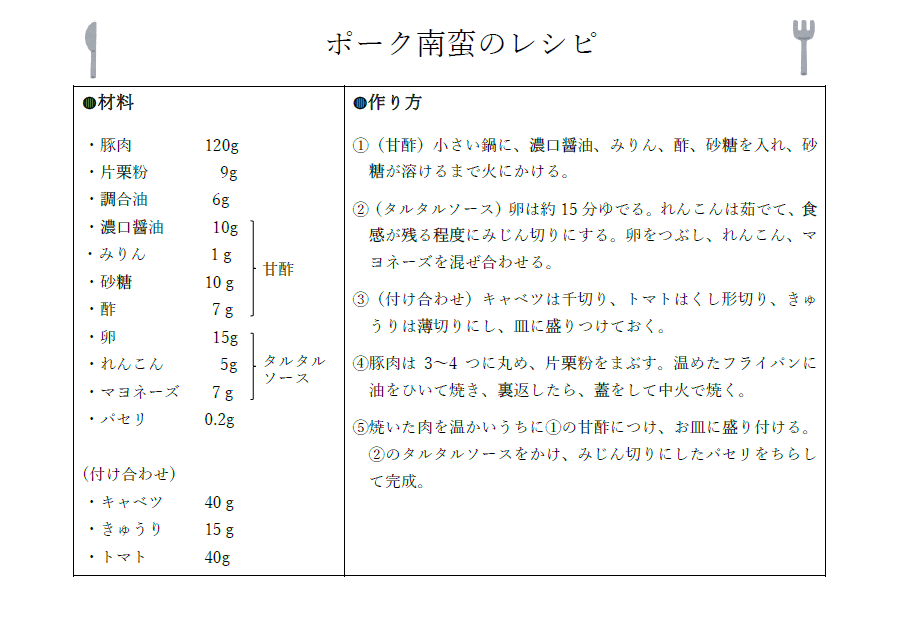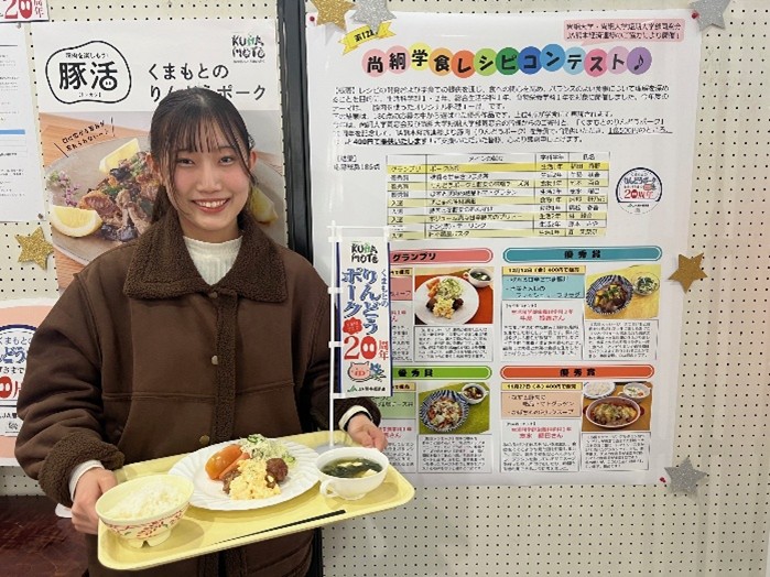 第12回尚絅学食レシピコンテストでグランプリを受賞した生活科学部 栄養科学科1年 福田 春野さんのレシピ『ポーク南蛮』を11月21日(金)に本学の学食で販売しました。