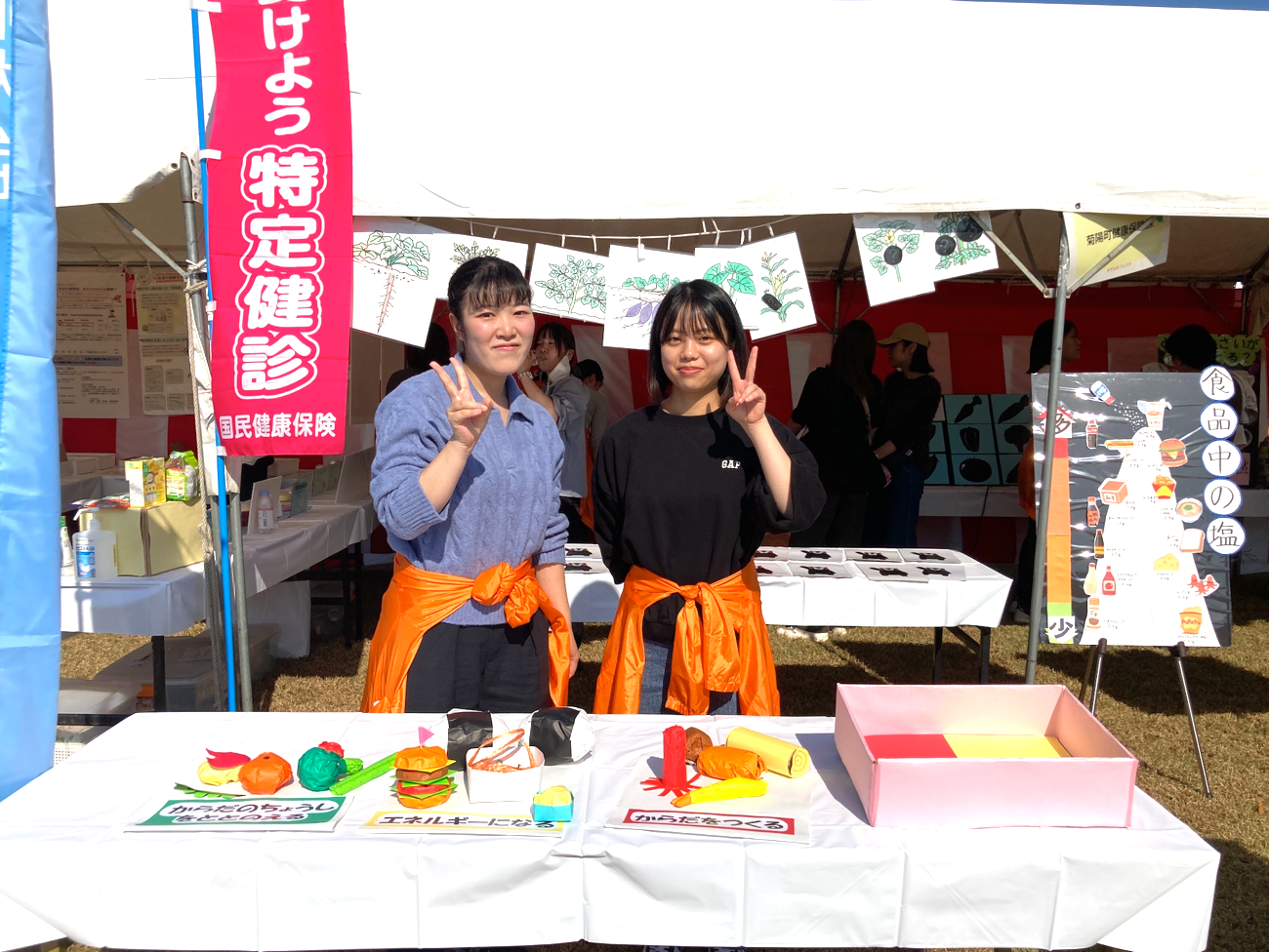 「すぎなみフェスタ」は、地域の皆様と学生達と直接ふれあうことができる貴重な機会です。本学ブースでは、菊陽町の健康づくりの一助となることを目指し、高血圧症・糖尿病予防として、減塩をはじめ、栄養バランスや野菜摂取等について、楽しみながら学べる食育を実施しました。