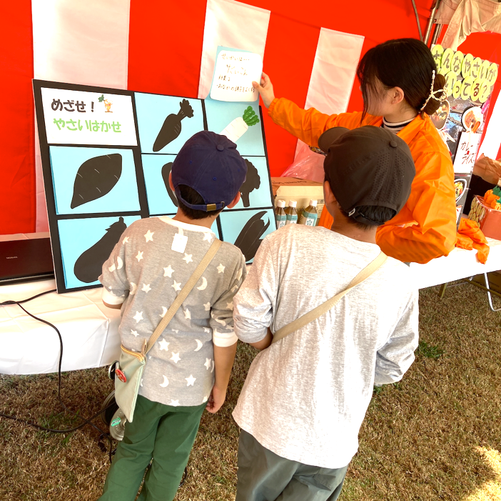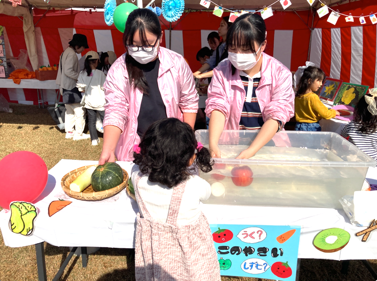 本イベントで使用した食育の媒体は、すべて学生たちが考え・作成したものです。食物栄養学科では、野菜の切り口を使った「カラフル野菜スタンプ」、水に浮くか沈むかを試す「野菜の浮き沈み実験」、種から野菜を当てる「野菜クイズ」を行いました。生活科学部では、野菜カードとキラキラシールが貰える「野菜クイズ(ガチャポン)」、パネル式「人参クイズ」、食品の栄養素分けクイズ「3つの栄養列車に分けてみよう」、料理を選んで栄養バランスを学ぶ「栄養バランス弁当の盛り付けにチャレンジ!」などを行いました。小さなお子様から保護者の方々まで、多くの来場者が参加型の食育ゲームに挑戦されました。