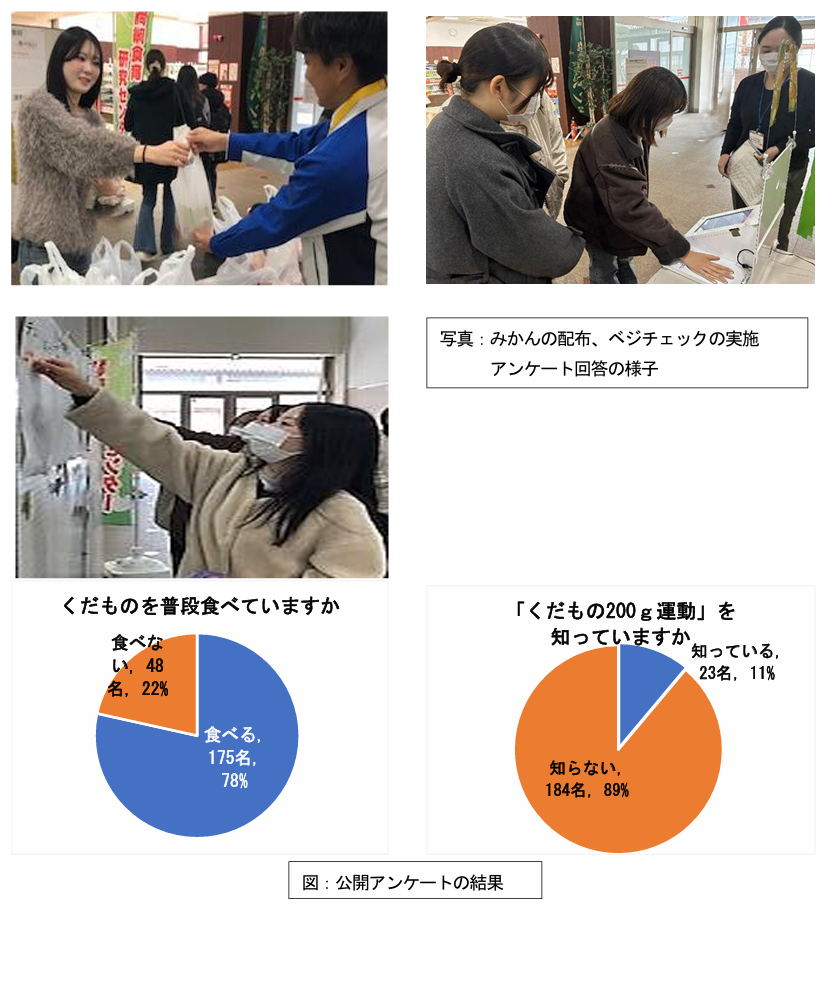 熊本県果実農業協同組合連合会様から、「夢の恵」というブランド名の温州みかん約1,500個の提供に加え、くだものクイズや野菜摂取量(推定値)が測定できる「ベジッチェック」も設置していただきました。たくさんの学生たちは笑顔でみかんを受け取り、そのおいしさを実感していました。また、「ベジチェック」の結果を見て、日頃の食事を振り返る様子がありました。