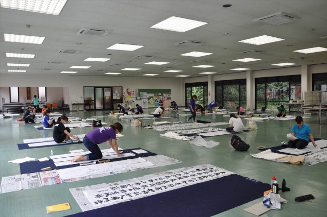 学生ホールの机やイスを片付け、広々とした空間で書道に打込みます。