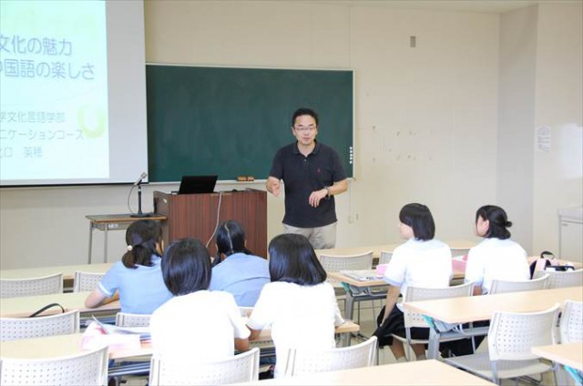 7月23日(土)・24日(日)に尚絅大学のオープンキャンパスが開催されました。本学部では、全体説明、学部説明会の後、日本語日本文学コース、現代コミュニケーションコース、司書課程、教職課程の模擬授業が午前午後を通して行われました。また卒業生や在学生を交えた座談会やキャンパスツアー、異文化体験コーナーでの中国茶飲み比べやチマチョゴリ・チャイナドレスを試着した記念写真撮影会がありました。
