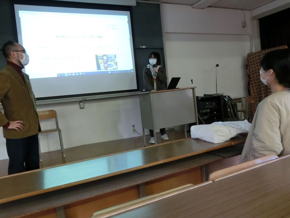 三浦准教授のゼミには、マンガを研究したい学生3名が参加しています。授業最終日には、この半年間の学びをふまえ、どのような卒業論文を構想しているかについて発表をしました。和気あいあいとした雰囲気ながら、学問に対する真剣さも感じられる、大学ならではの学びの場になっています。