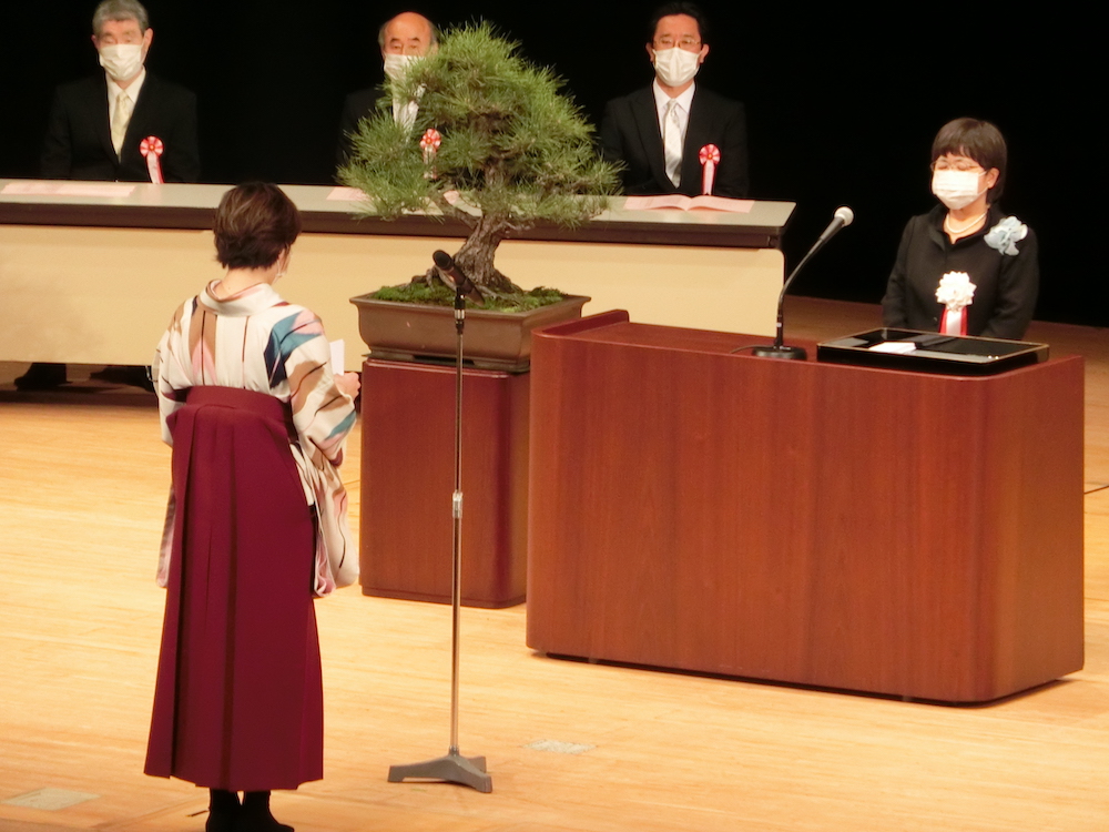 式典の「卒業生代表挨拶」は、大学・短期大学部の全卒業生を代表して、文化言語学部の川上紗央莉さんが務めました。本学や留学先での学びについて、友人たちとの楽しい語らいについて、また本学の建学の精神にもある「智と徳を兼ね備え社会に貢献し得る女性」に向けて努力しつづけることについて、壇上で立派に述べてくれました。