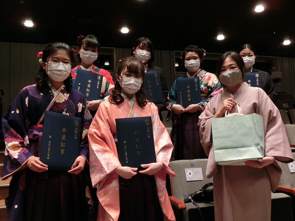 3月24日(水)、熊本県立劇場・演劇ホールにて、尚絅大学・尚絅大学短期大学部の卒業式が行われました。新型コロナウイルス感染拡大防止のため、時間を短縮し、また内容を簡略化しての実施でした。