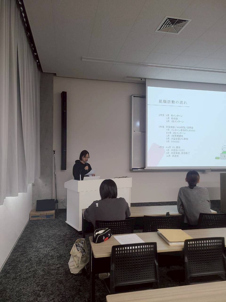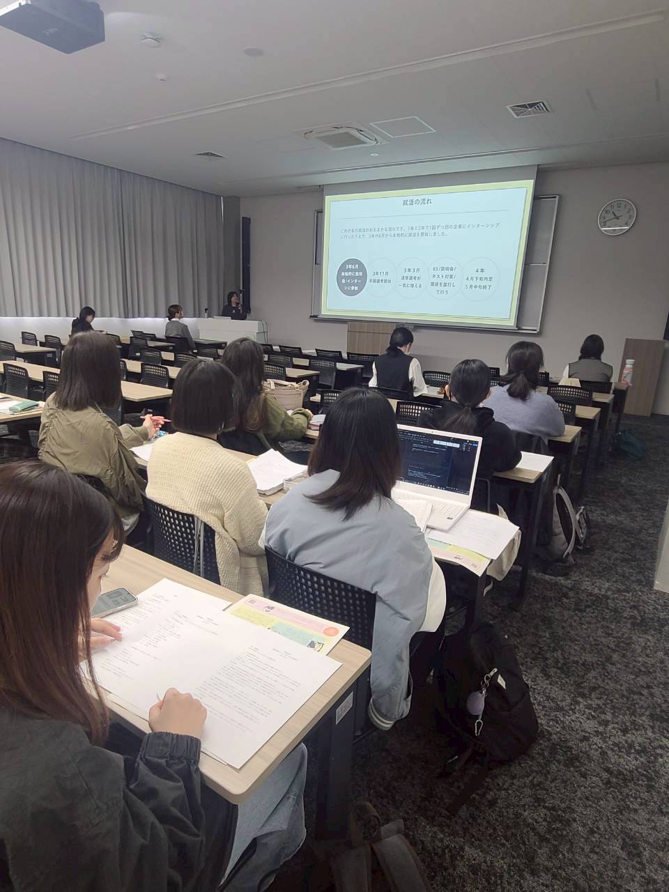 4年生の就職活動の経験に触発され、3年生もみな積極的に発言し、時々笑い声も上がる和気あいあいとした雰囲気の中で充実した回となりました。授業後も4年生に質問する3年生の姿もあり、先輩たちの後押しでこれからの就職活動への準備にも意欲が湧いてきた様子でした。