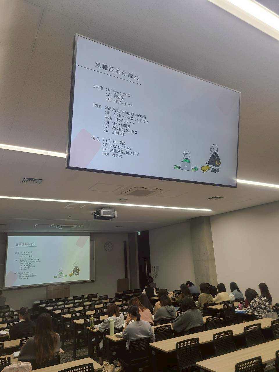 本学部では、正課外の授業として、3・4年生向けに「就職指導」の時間を設けています。就職活動に向けてさまざまな講座を実施し、学生のみなさんの将来の進路に向けてサポートをしています。