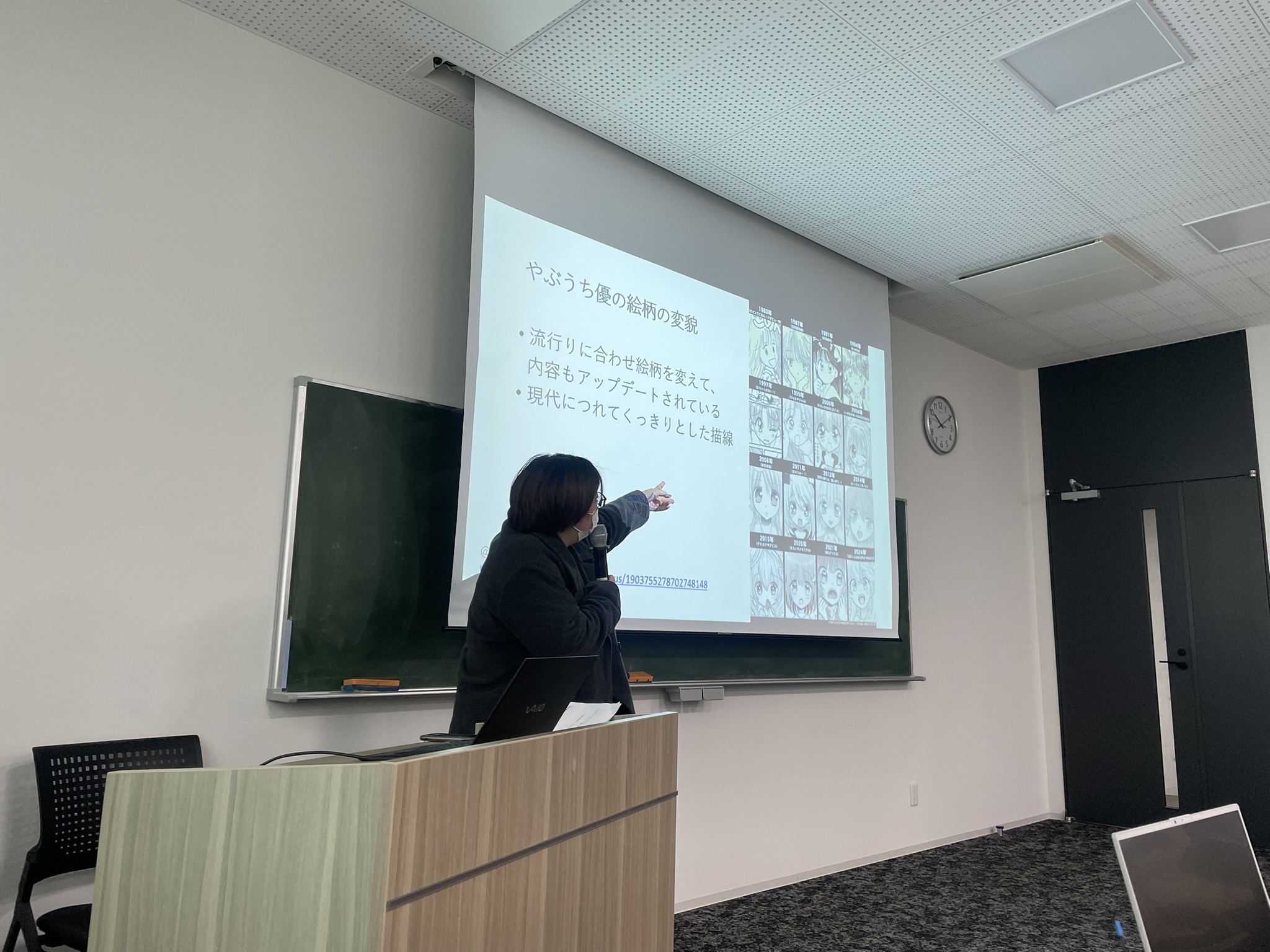 今年の研究の題目は「少年スポーツ漫画における話しことば:文末表現を中心に」「『聊斎志異』「画皮」における二次創作への展開」「アニメソングの変遷に関する研究」「ボーカロイド楽曲における「おさんぽMV」の研究」「『君たちはどう生きるか』の背景美術について」「少女マンガにおける「異性装」ーやぶうち優の作品を事例にー」「現代の無頼派表象ーバーで酒飲む太宰・安吾・織田作像ー」「「女子力」という言葉の現在地ー「女性規範」と若年女性のジェンダー意識ー」「九州の駅弁事情と未来について」「地方観光における”御朱印女子”の消費行動とSNSでの情報共有」「日本と韓国の高校生の読書に関する研究」などなど。これらはほんの一例ですが、学生たちの卒論テーマの多様さがよくわかるのではないでしょうか。
