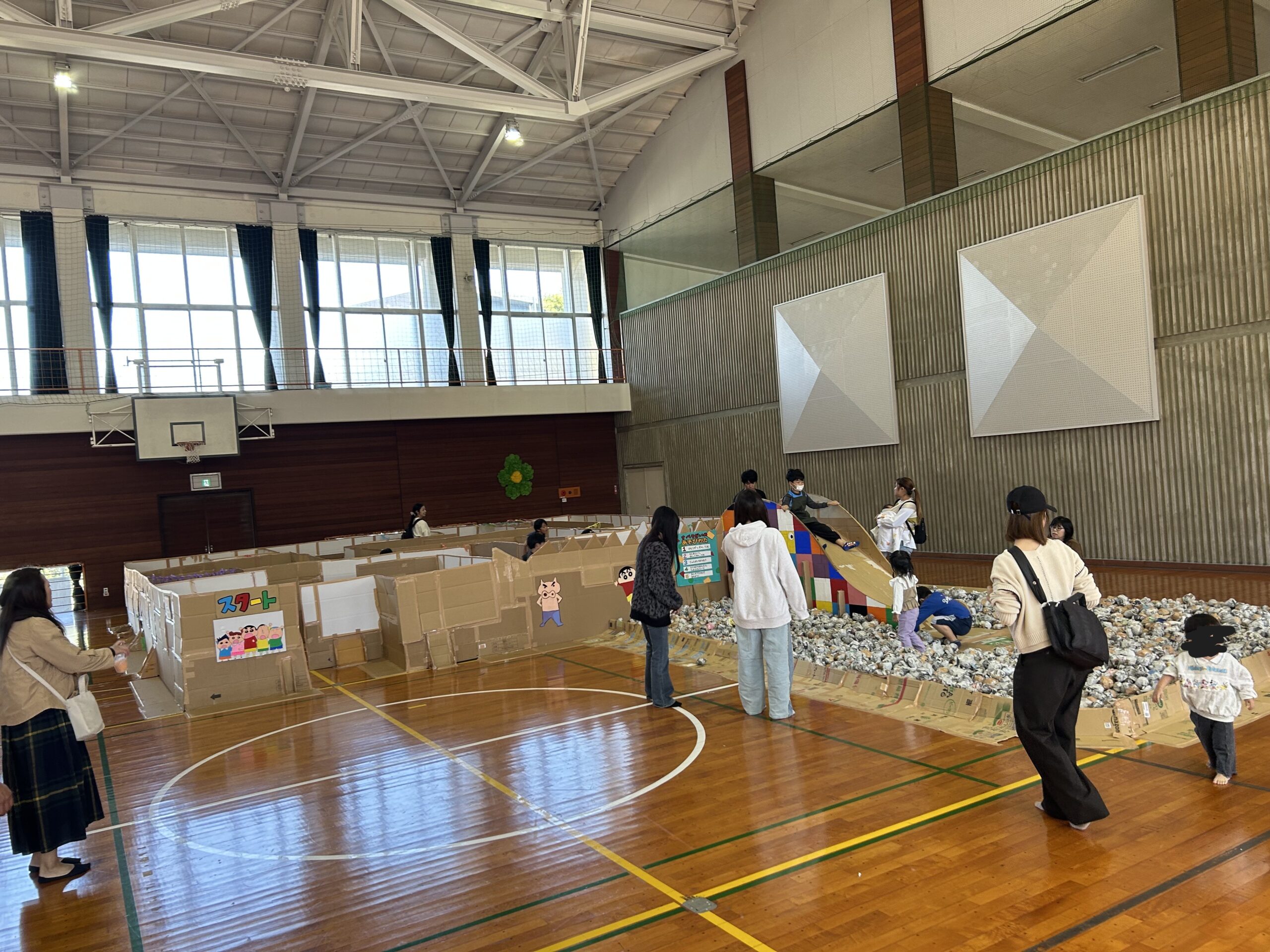 また、体育館では「ちびっこランド」を開設し、段ボールで制作された遊具でたくさんの子どもたちが楽しむ様子も見られました。
