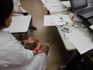 | 心電図の測定を行っています | 2点識別閾測定法による感覚の検査を行っています |