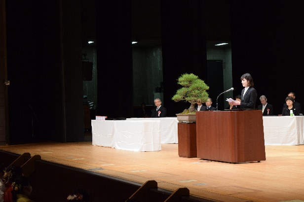 卒業式では、学生代表として楠元真優香さんが学長から卒業証書・学位記を授与されました。続いて在学生代表送辞を川中優実さん(3年)、卒業生代表答辞を杉内蒔歩さんが述べました。育英褒章は本学部の学生代表として岩下千夏さんに授与されました。