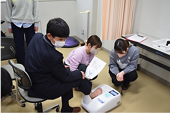 髙山教授によるスポーツ栄養講座では、運動に必要なエネルギーや、たんぱく質・カルシウム・鉄分などの栄養素について学びました。その後、実際に本学売店の商品からスポーツに適した昼食を選ぶ体験を行いました。本学学生と一緒に、テーマである「ケガをしない体づくり」を念頭に、普段はあまり意識することのない食品表示を確認し、真剣に選ぶ姿が見られました。また、骨密度測定を実施し、澤部講師から一人ひとりに具体的なアドバイスがあり、生徒の皆さんは自身の体の状態について理解を深めていました。