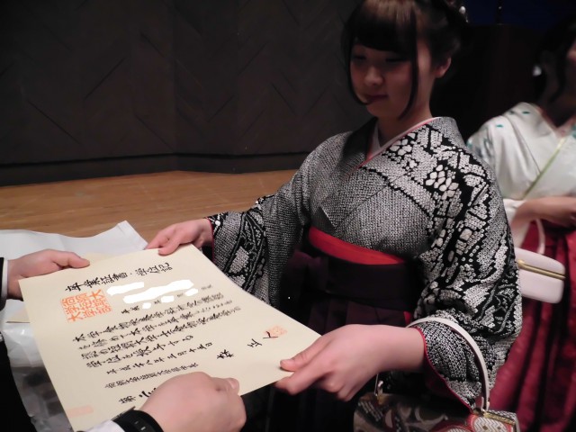 当日は、多くの学生が袴や着物を着て、とても華やかな雰囲気のなかで、本学科の卒業生76名の門出を祝うことができました。また、卒業式のあとにはクラス担任から一人ずつに卒業証書が手渡されました。
