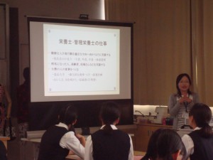 テーマは「栄養士・管理栄養士の仕事について」で、バランスの良い食事の大切さや、栄養士・管理栄養士の活動分野、資格取得の方法などの説明を行いました。みなさんメモを取りながら熱心に耳を傾けていました。中には、栄養士・管理栄養士を希望している人もいるようでした。