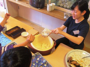 | (3)配膳のお手伝いをしました。子どもたちに食べられる量を聞きながらつぎ分けます。とてもにぎやかです! | (4)食育指導では紙芝居を発表しました。子どもたちが予想以上に真剣に聞いてくれて、話しやすかったです。 |