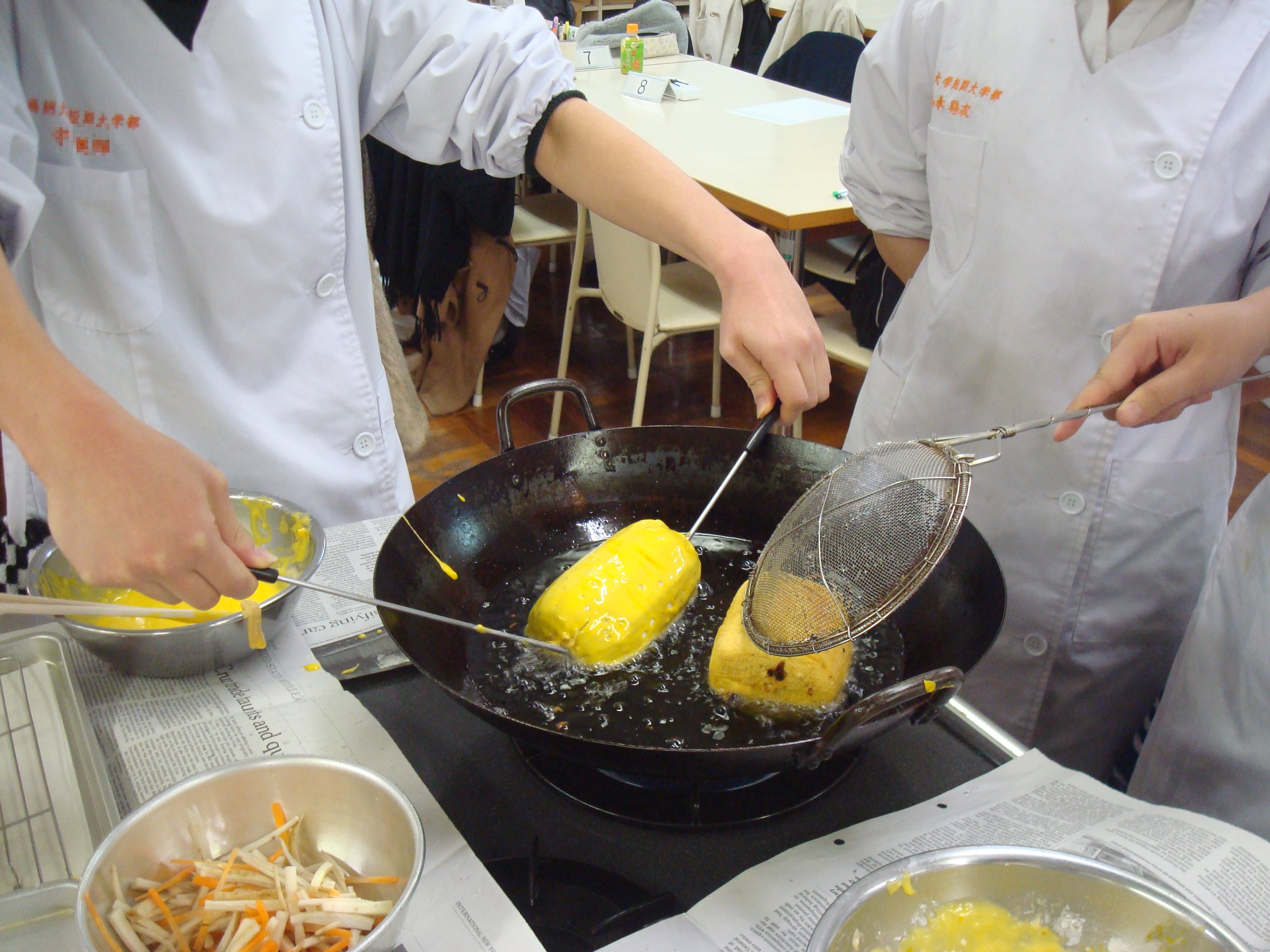 この実習は、調理学実習Ⅰ・Ⅱに続くもので、和・洋・中の様式別調理の特徴・形式を学び、応用力を身につけることを目的としています。 実習を通して、様式別調理の特殊材料とその扱い方を修得し、食文化の伝承・様式別食事作法について理解を深めます。
