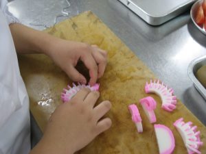 | かまぼこは飾り切りを行いました。冠を作っている様子です。 | 飾り切りでいろいろな形を作りました。 |