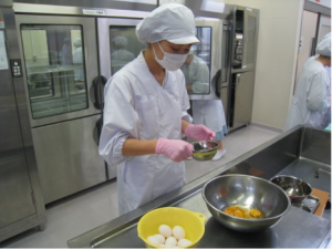 調理中は、皆で声を掛け合いながらコミュニケーションを取り、安全性、衛生面に考慮しながら美味しい食事を提供できるよう取り組んでいます。特に1年生の試食日は食数が2倍に増えるので、食事提供の時間に遅れないように頑張っています。