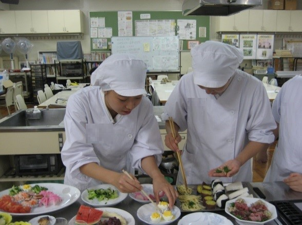 | ゆで卵に切込みを入れて、スタッフドエッグ を作っています。 | 班員と一緒に献立を確認しながら盛り付けを 行っています。 |