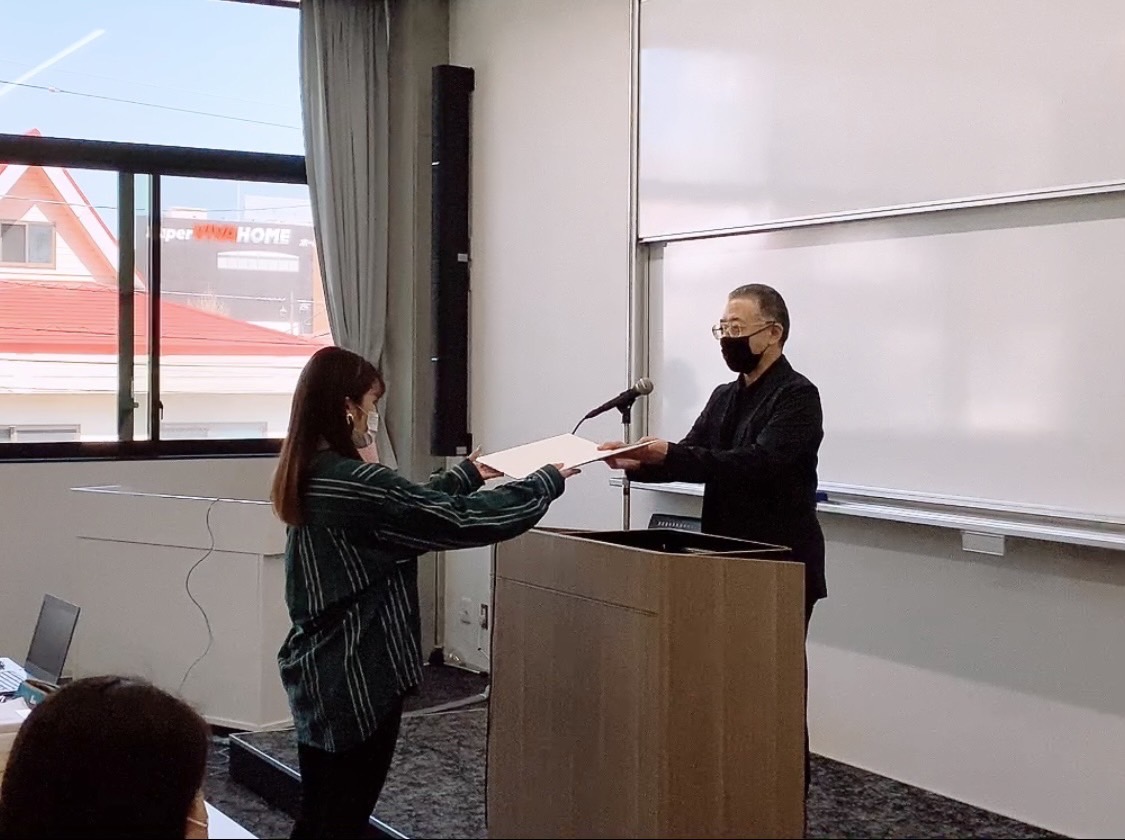 表彰式では、学科長より全栄協会長賞及び食品科学教育協議会会長賞の受賞者に証書授与が行われました。該当学生は緊張した面持ちでしたが、誇らしげな様子も伺えました。