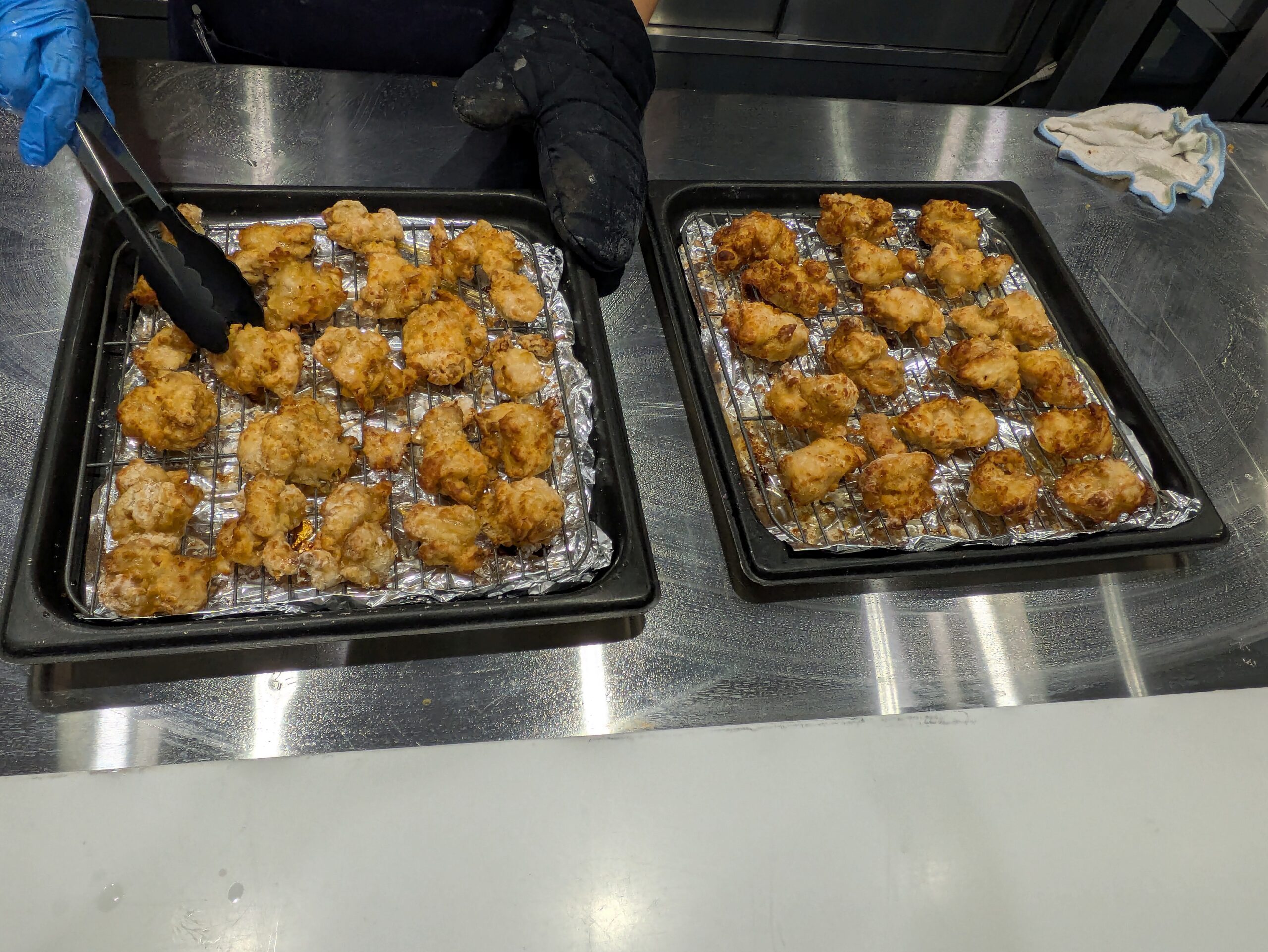 魚にまぶすパン粉は油をかけて事前にスチコンで焼いておくことで、揚げなくても香ばしい衣を作ることができます。この衣を魚にまぶしてスチコンで揚げ焼きにすると…美味しいフライの完成です。