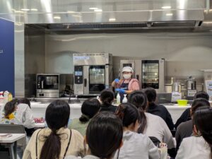 このように、学外の先生からお話を聞く機会は大変貴重であり、参加した学生も熱心にメモをとっていました。また、「改めて最新の調理機器の使い方を学ぶことができた」との声もあり、実演中や実演後も質問する学生が多く、今回の学外学修によって日進月歩で進化する調理機器にさらに興味・関心を深めたことが分かりました。これから就職や進学を控える学生にとって、今回の学びは大きな強みになると思います。