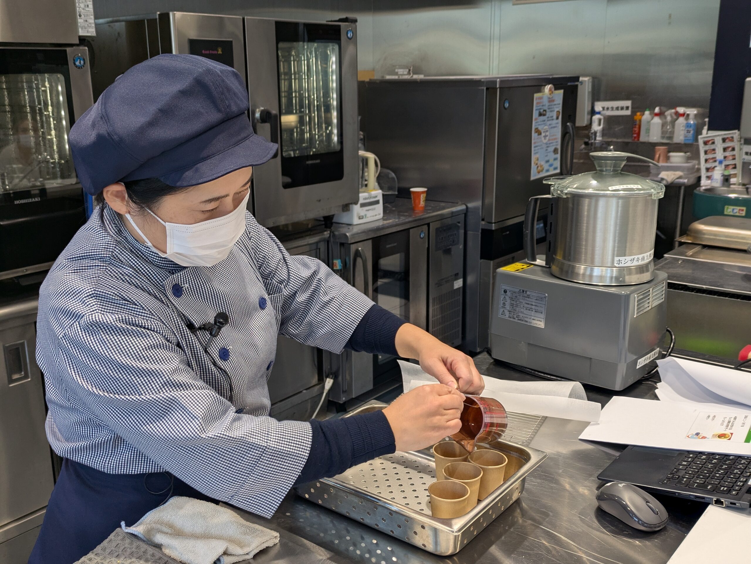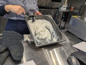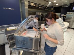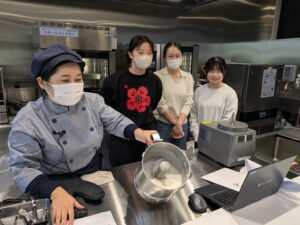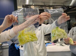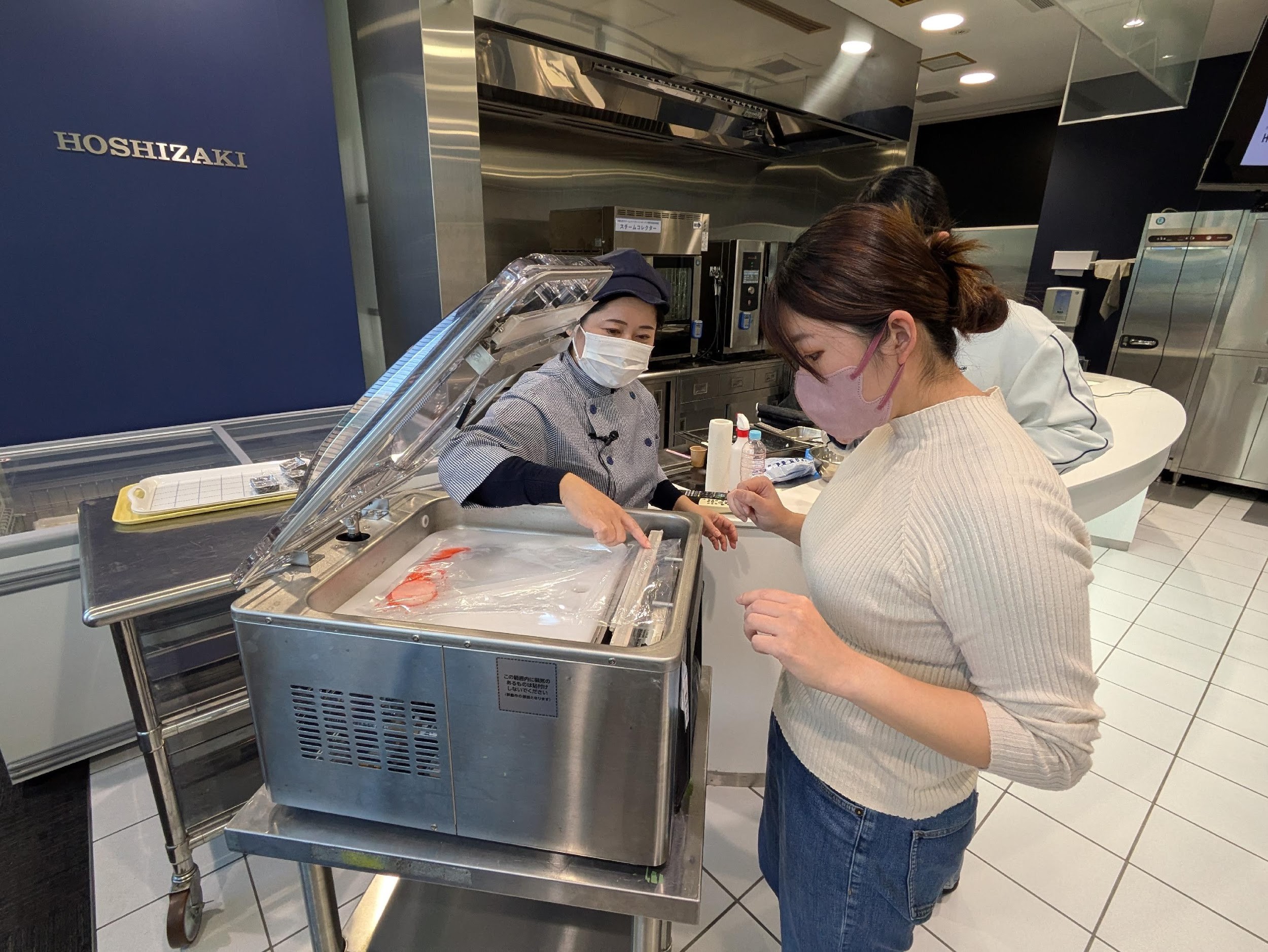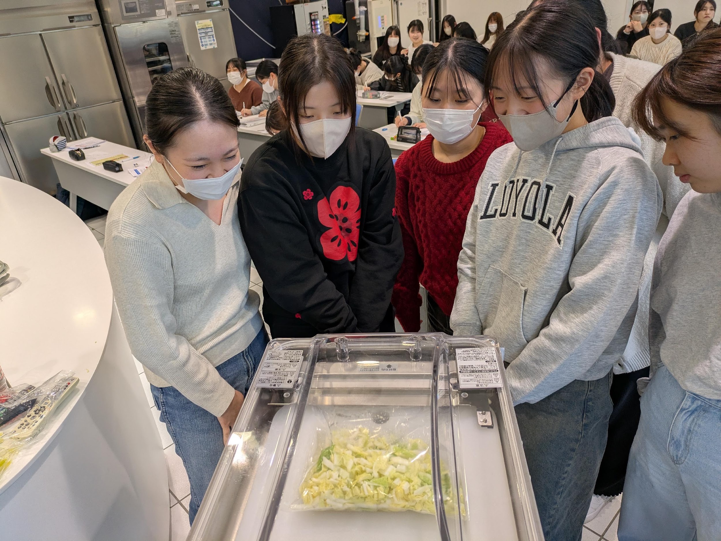 真空調理の実験や機器操作の体験では、学生の笑い声が上がる場面もありました。教科書で学ぶだけでなく、実際にやってみることで真空調理の良さを深く理解できました。