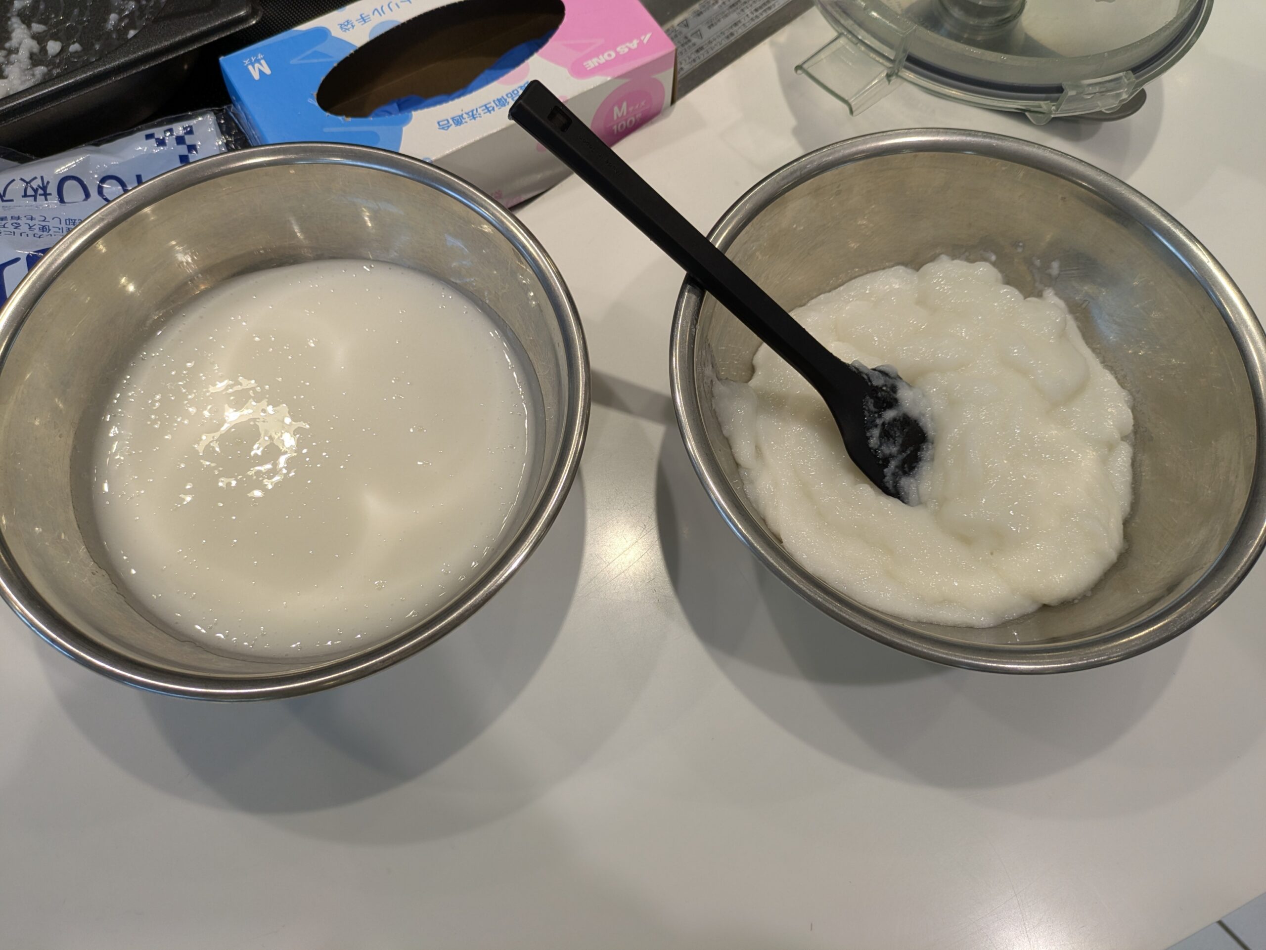出来上がったお粥はブリクサーにかけることで、とても滑らかな粥ミキサー(写真右の左側)に仕上がります。その際増粘剤も同時に混ぜると簡単に粥ゼリー(写真右の右側)を作ることができます。