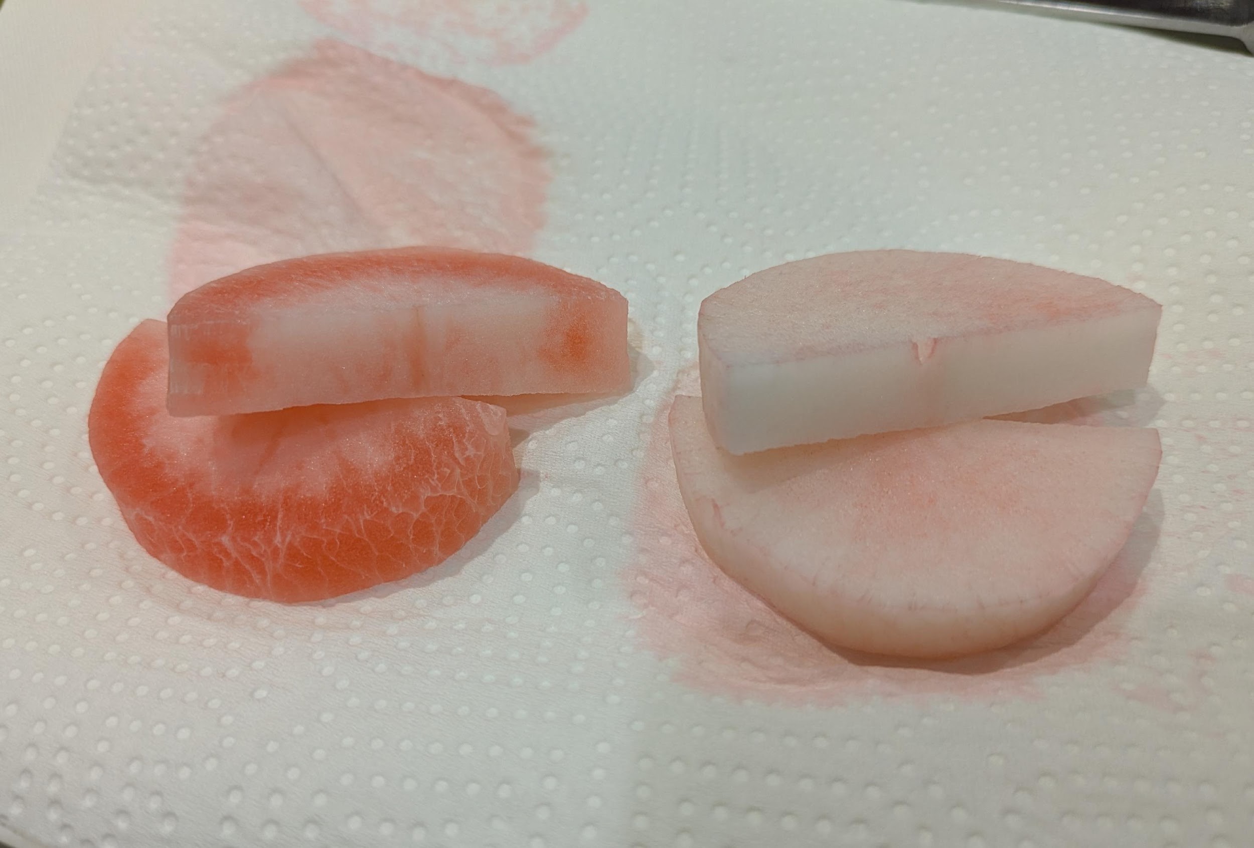 【大根の味染み実験】 左:真空調理 右:手で揉んだもの